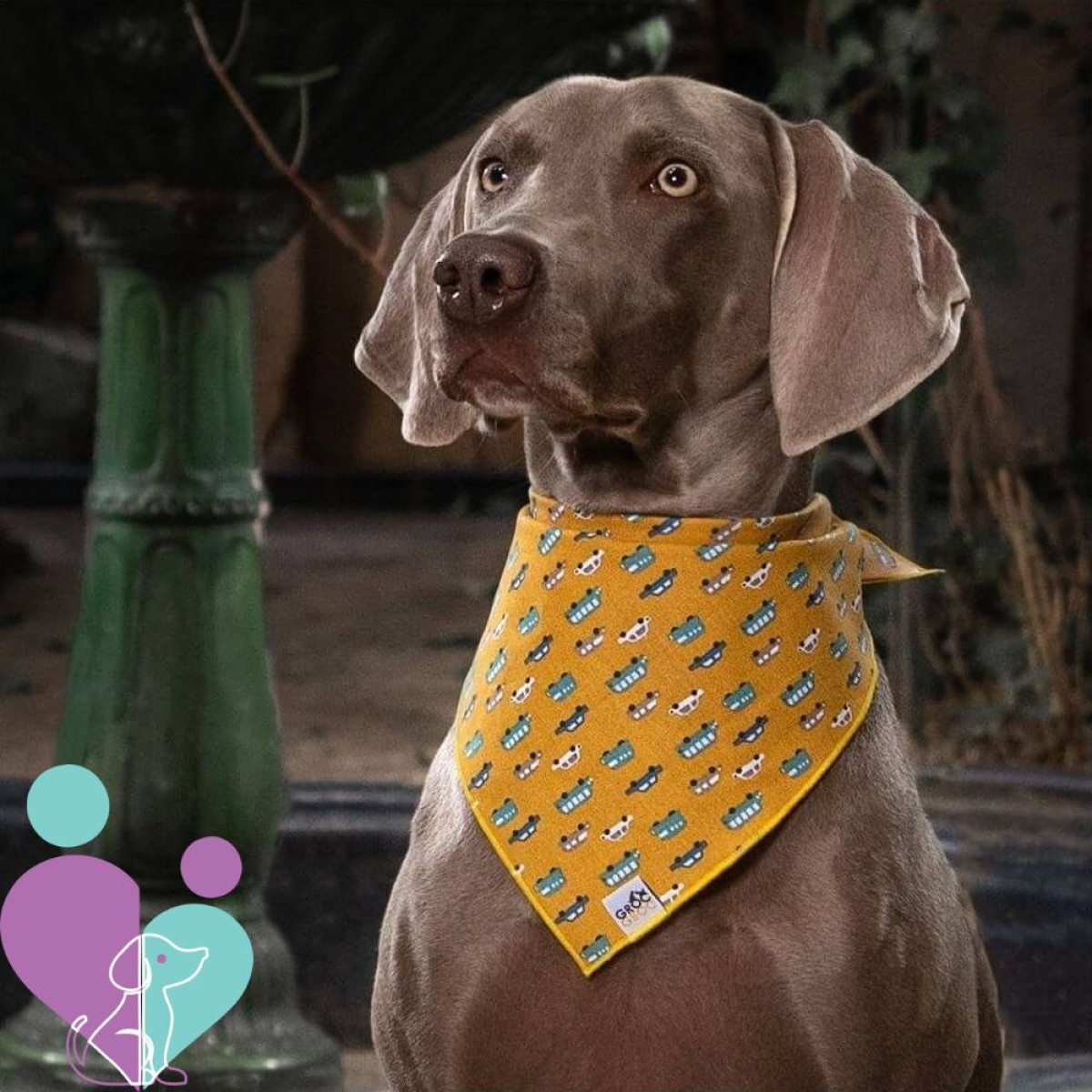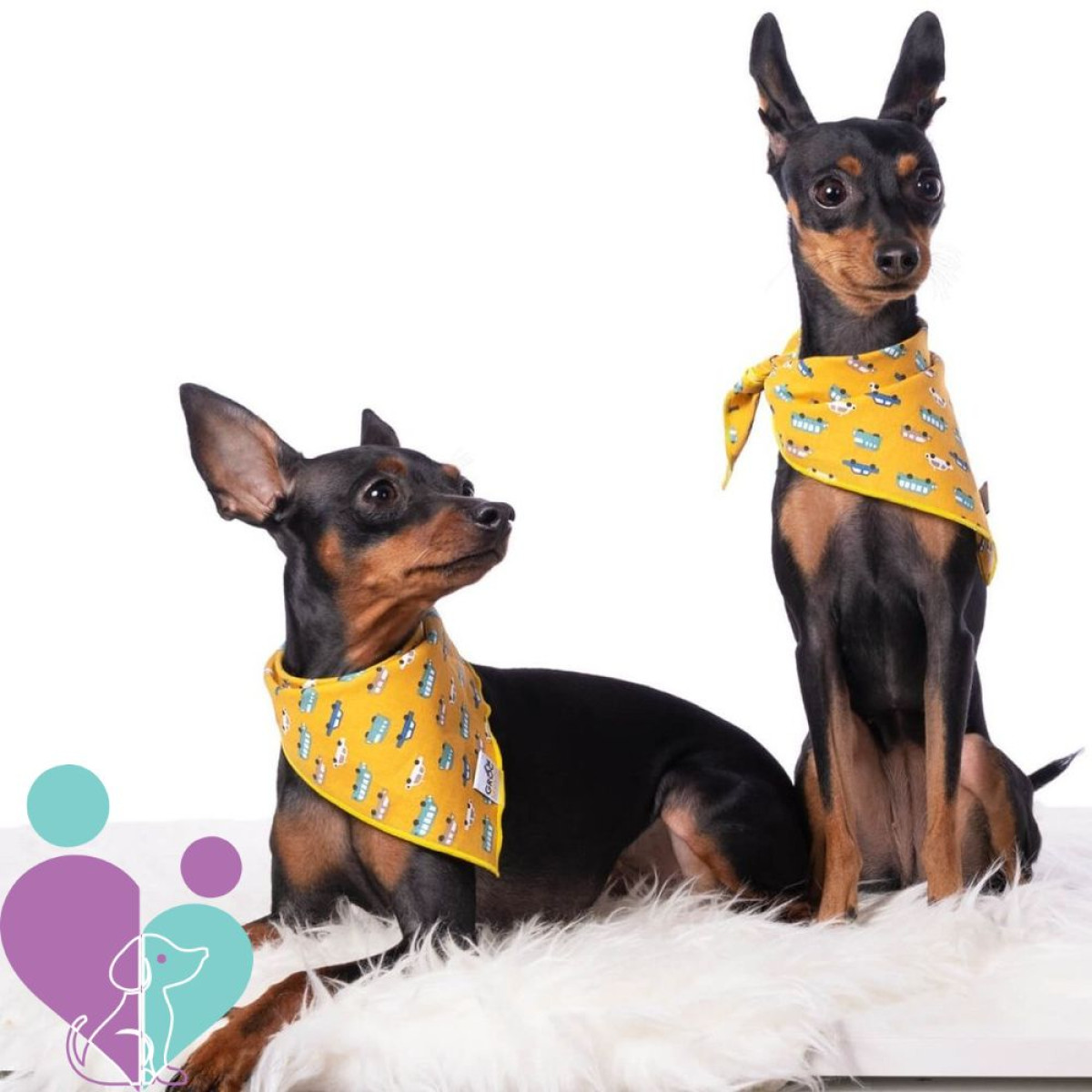 Háromszög alakú kutyakendő sárga díszítéssel. . Színes nyomatának és pamutszövetének köszönhetően a kutyakendő kedvenced dekoratív viselete lesz a mindennapi életében.