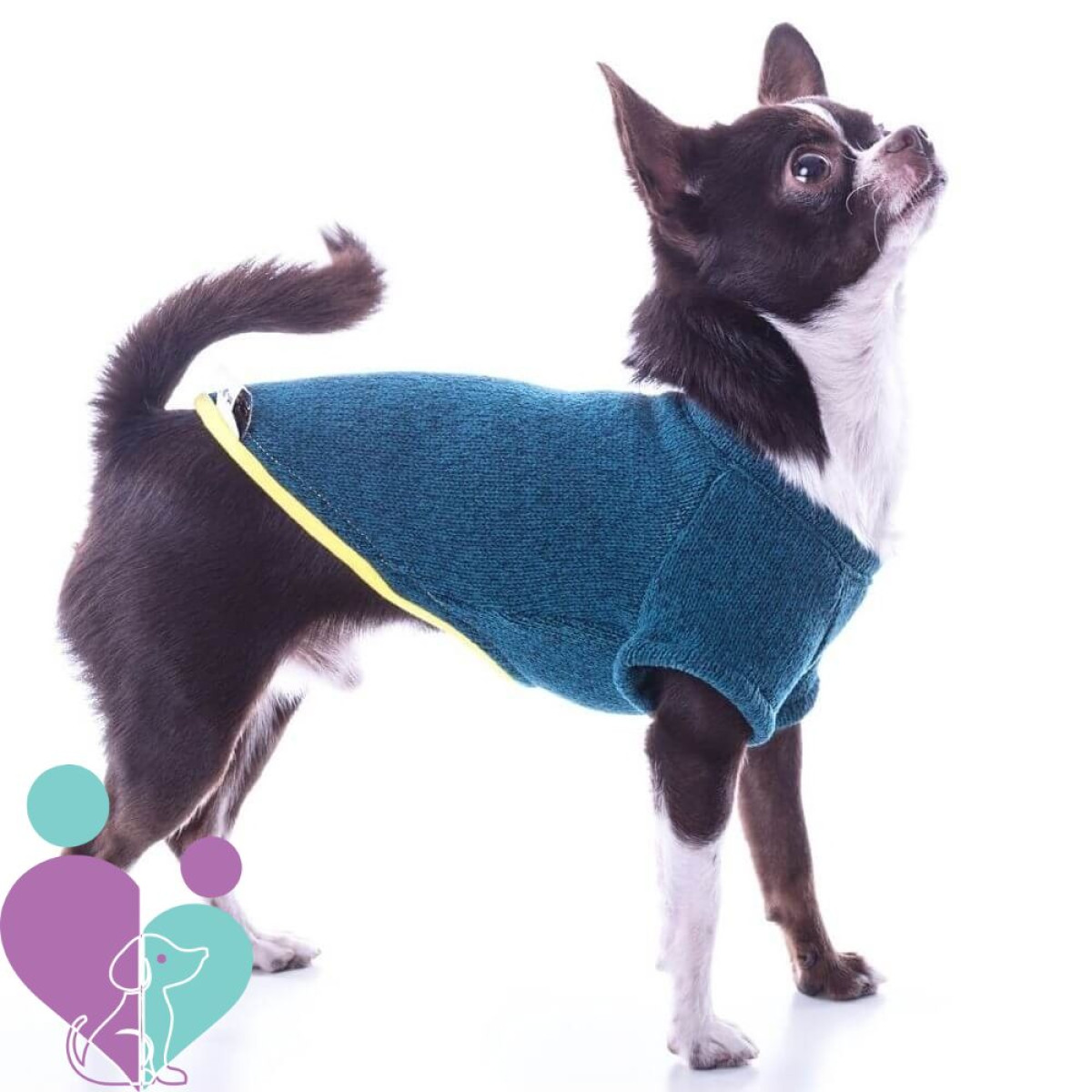 Kék, kötött mintás kutya pulóver, sárga szegélyes kutyaruha