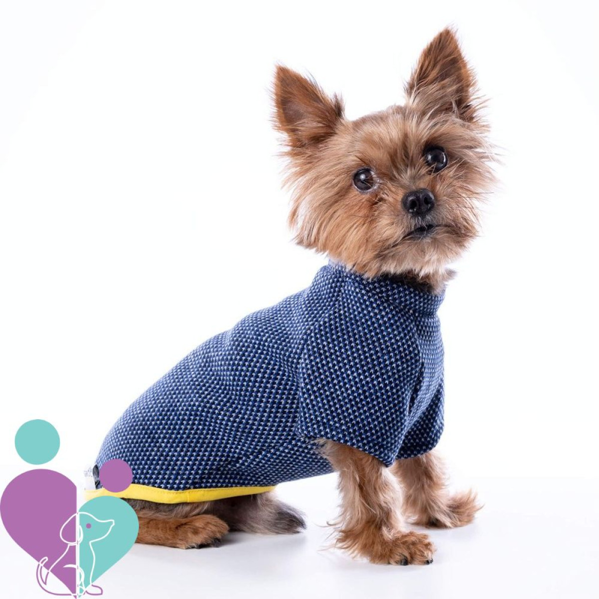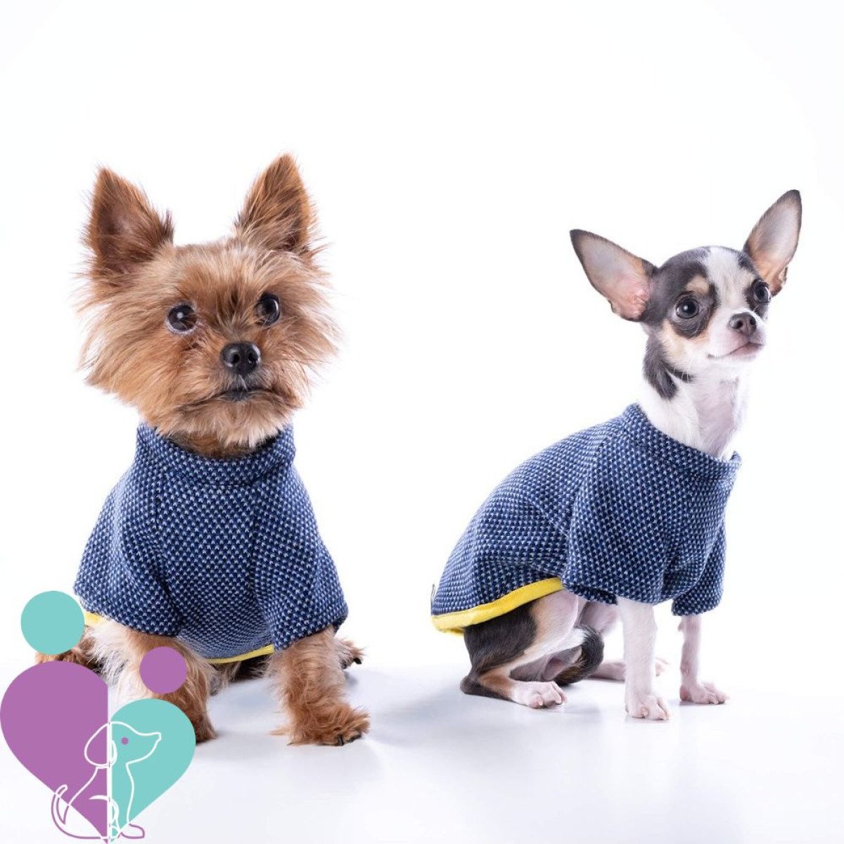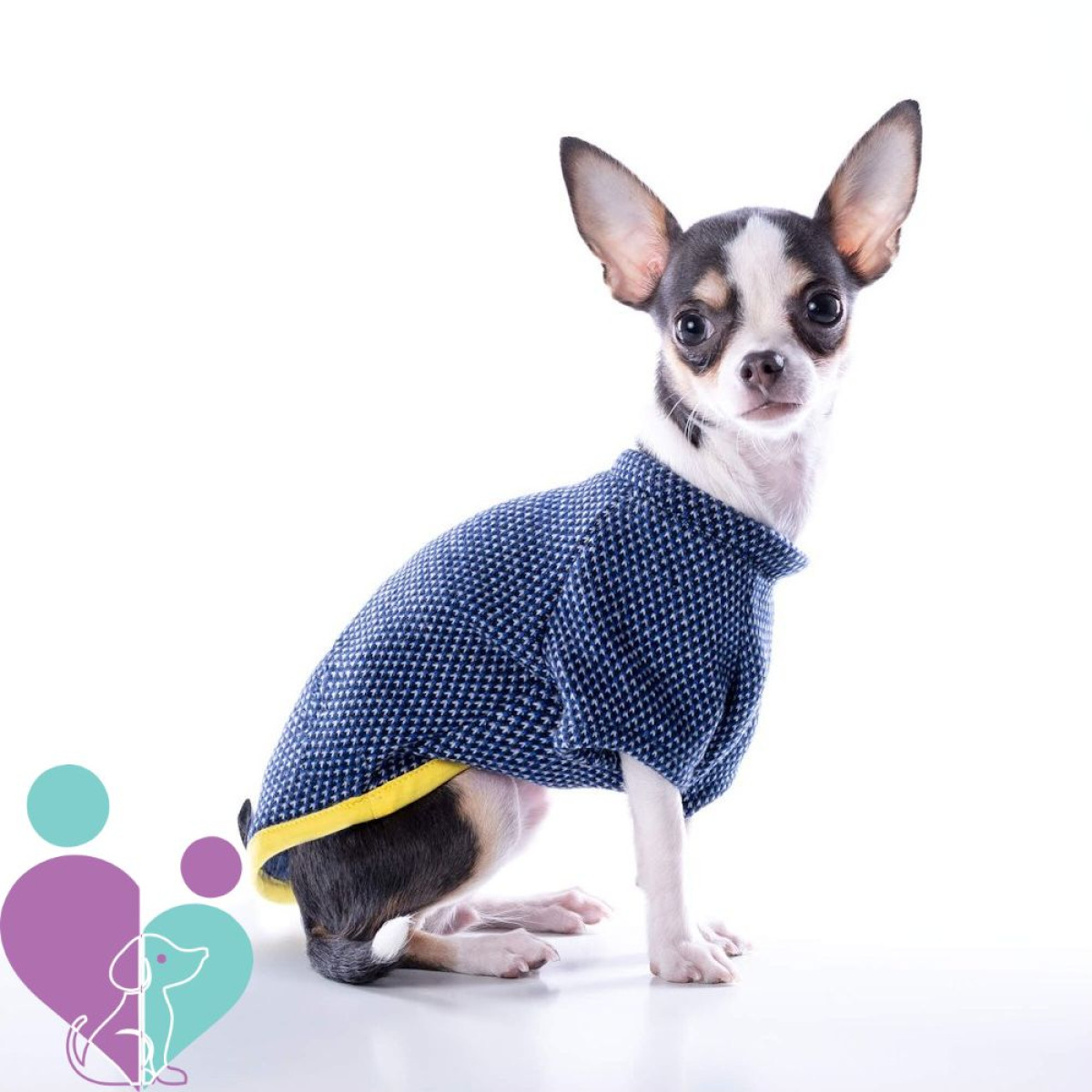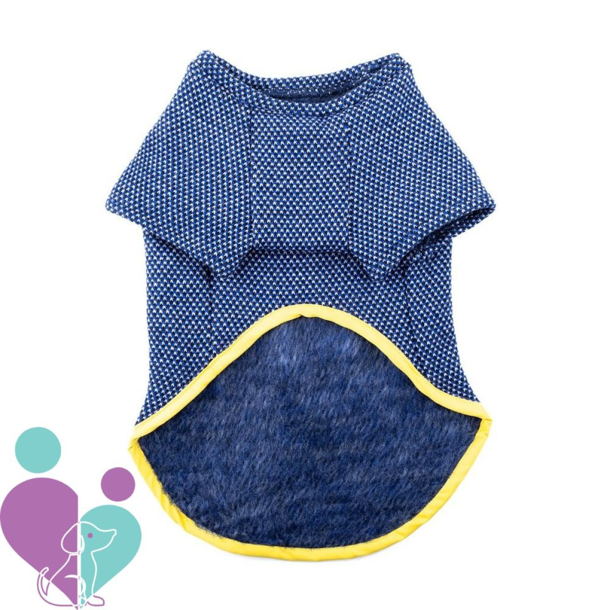 Kutyapulóver közepes vagy kicsi kutyának, elasztikus kék tweed és meleg kék polár belsővel.