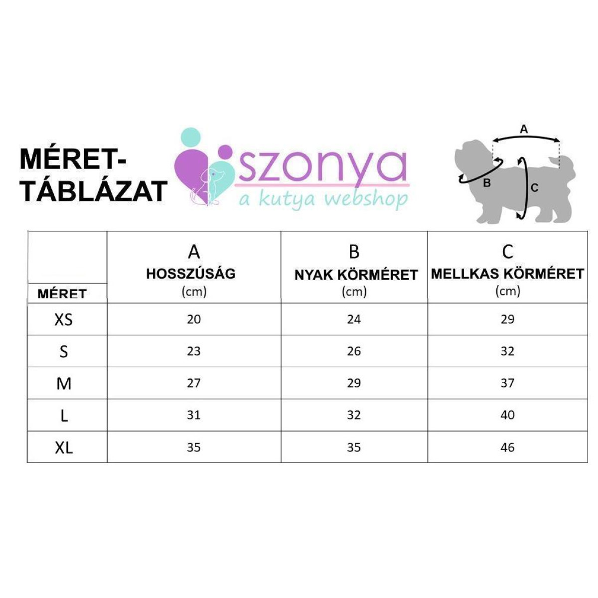 Kombinálhatod táskával vagy sállal a tökéletes megjelenés érdekében. Kezelési útmutató: Mosógépben 30°C-on mosható, nem fehéríthető, szárítógépben nem szárítható. Kifordítva vasalható. A kutyád megfelelő méretének meghatározásához tekintsd meg méretezési útmutatónkat.